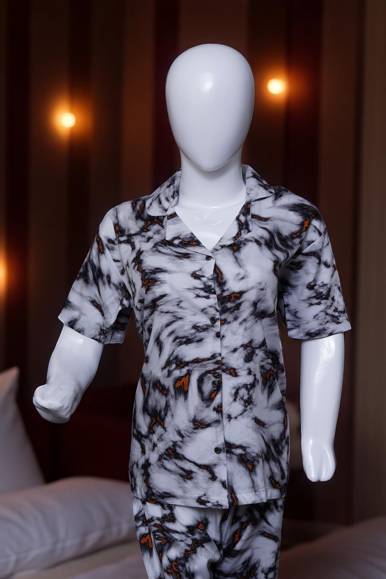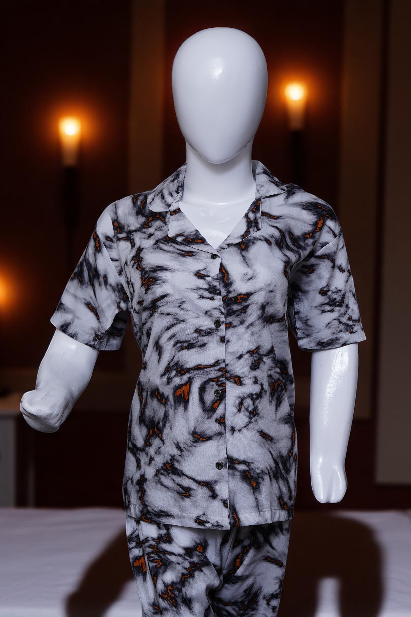 Discover a new level of relaxation and unique style with our Abstract Marble Print Button-Up Pajama Set. This chic two-piece ensemble is designed for those who appreciate both luxurious comfort and distinctive aesthetics, adding an artistic flair to your loungewear collection.