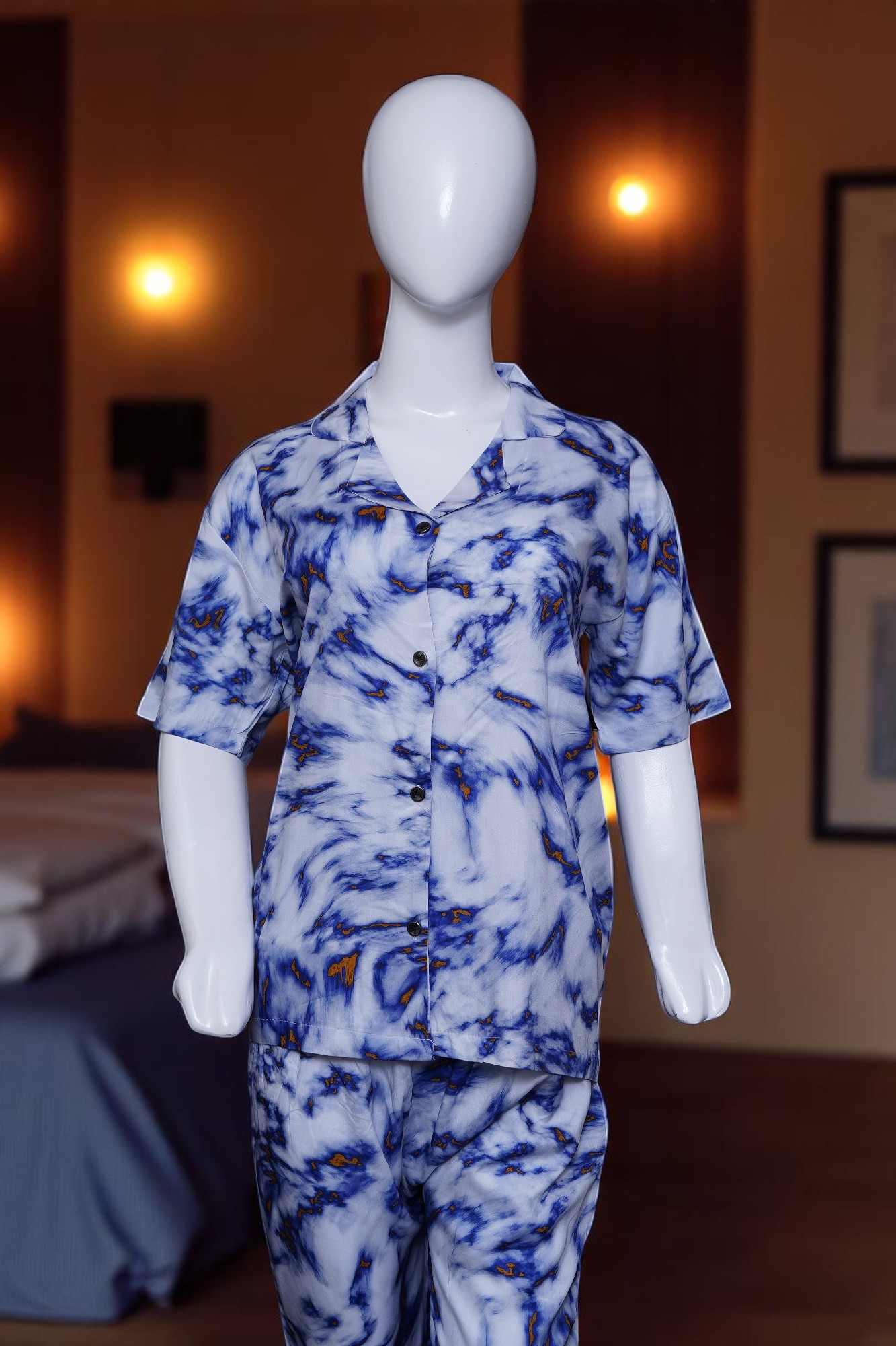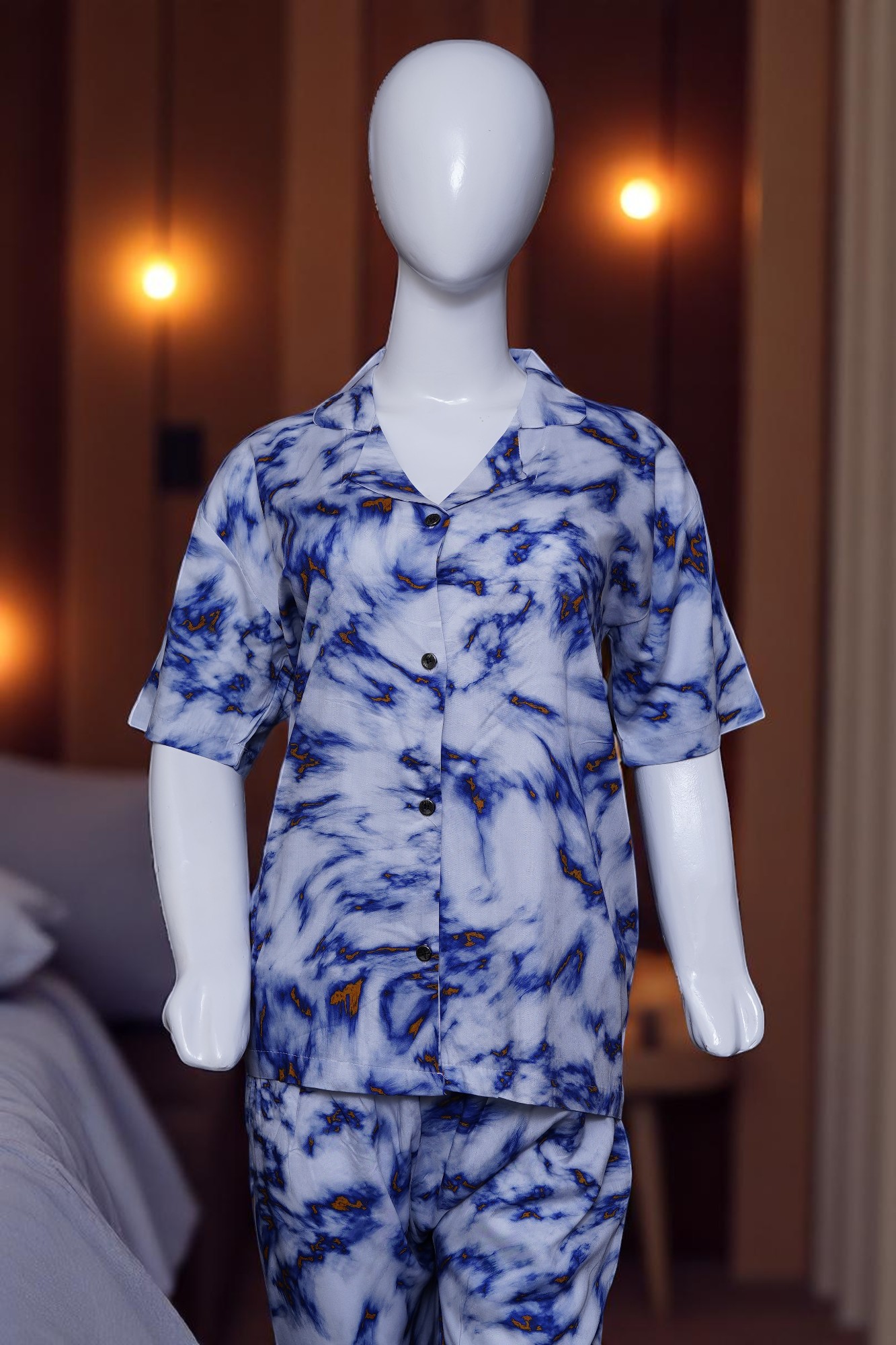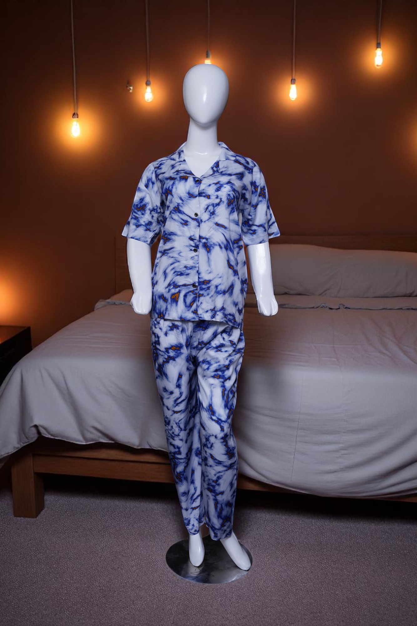 Unleash your creative spirit even as you relax with our Artistic Blue & White Tie-Dye Pajama Set. This unique two-piece ensemble is designed for those who appreciate both comfort and distinctive style, adding a vibrant touch to your loungewear collection.