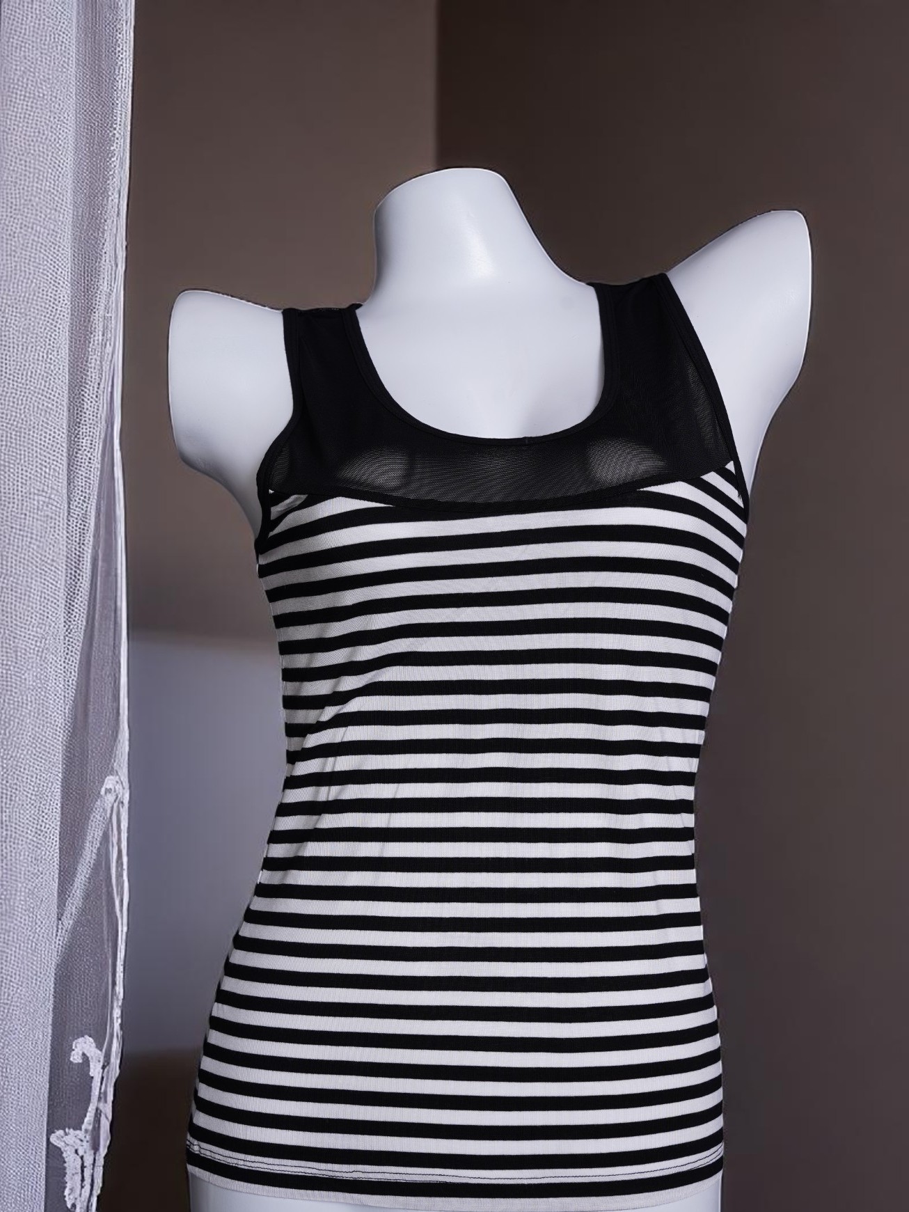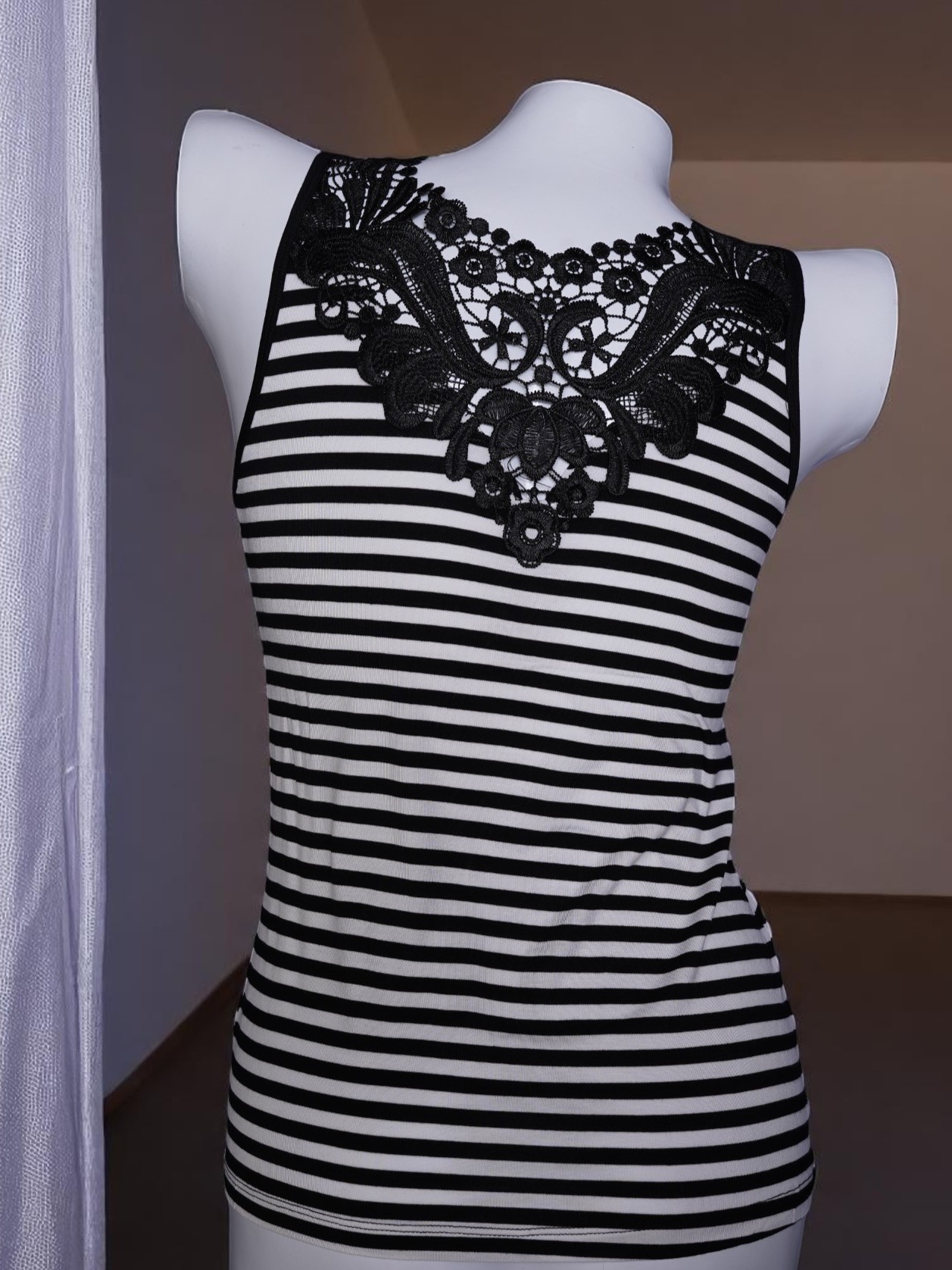 Stylish black and white striped camisole featuring a unique mesh insert at the front neckline and intricate black lace detailing on the back.
