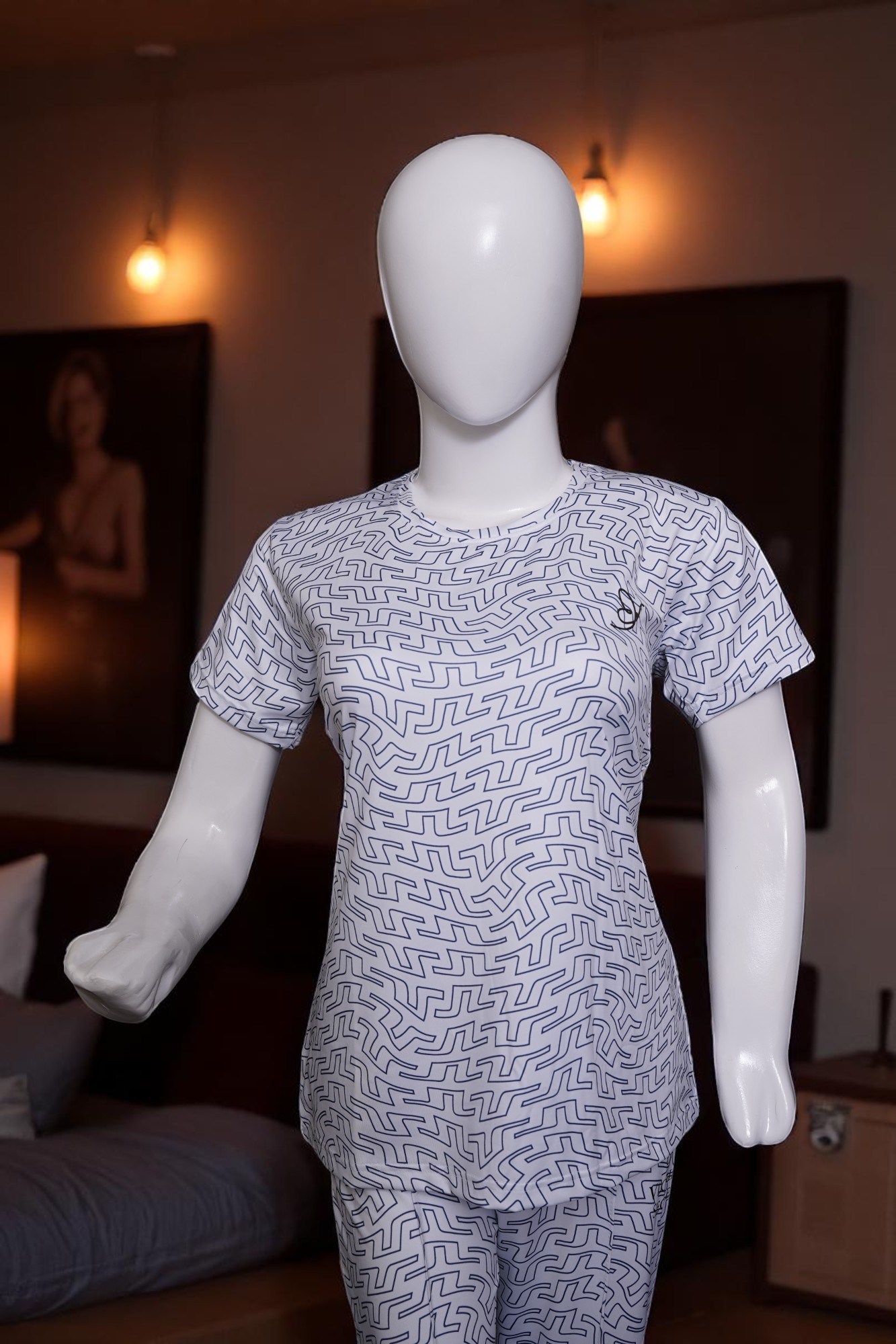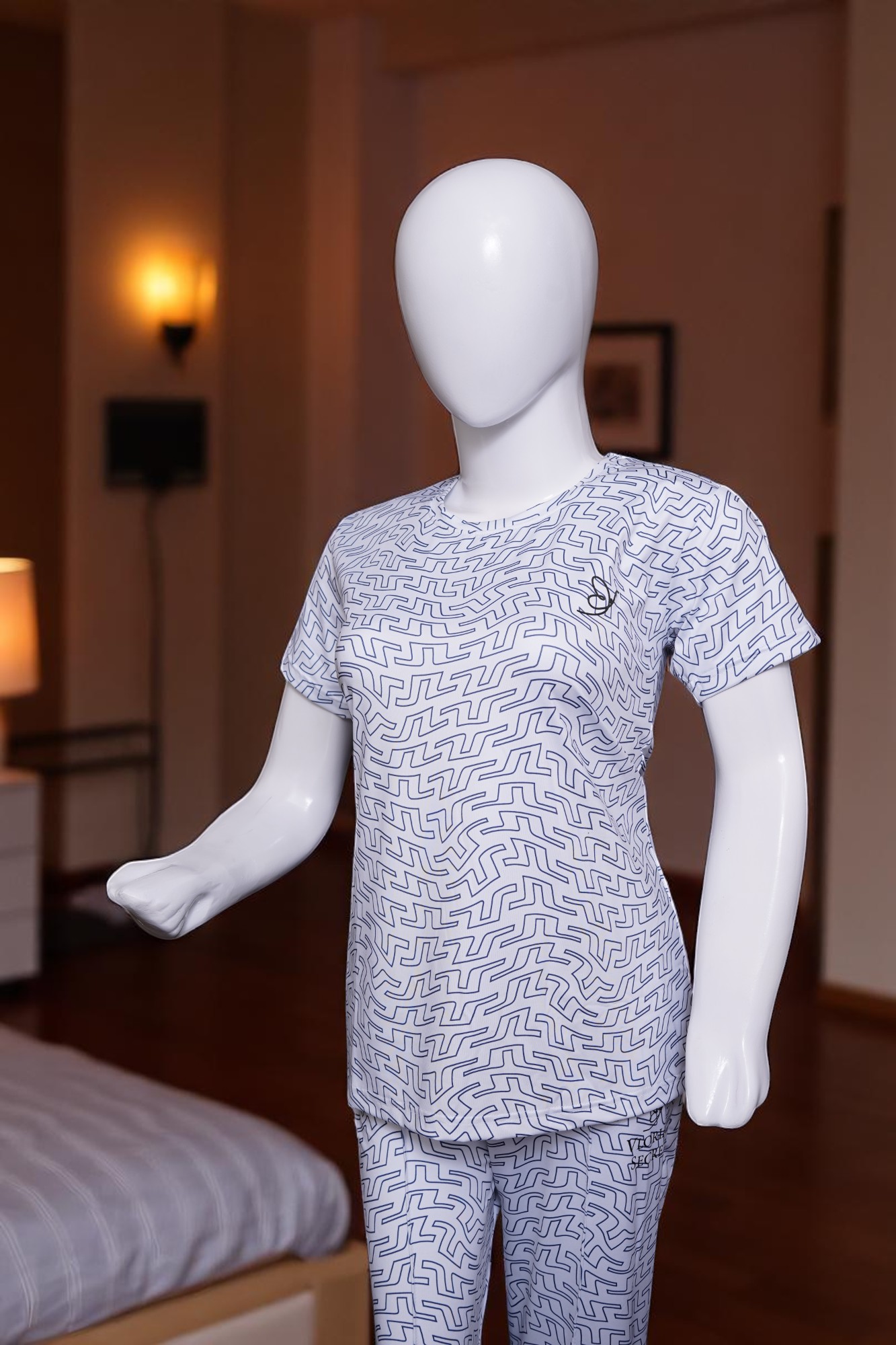 - Striking Geometric Design: Adorned with an intricate, repeating labyrinth-style geometric pattern in crisp black and white, offering a sophisticated and unique look that stands out from typical sleepwear.